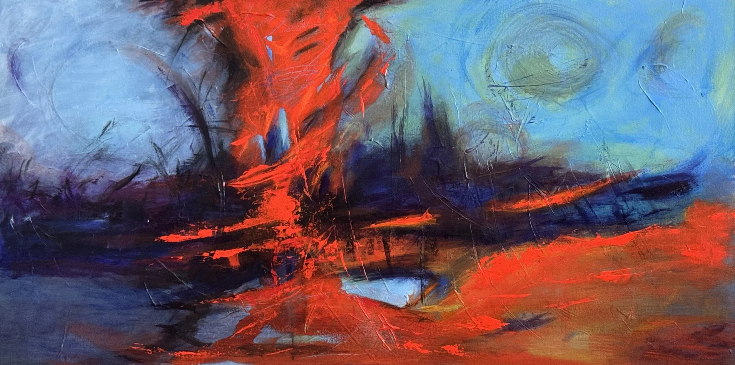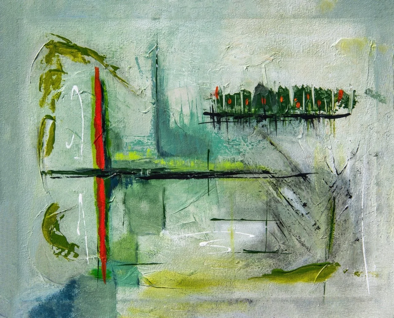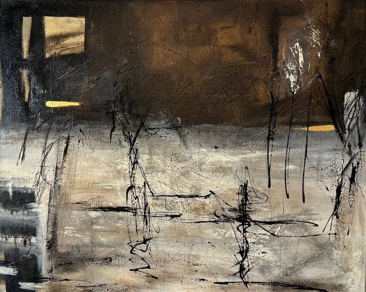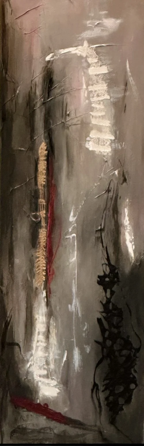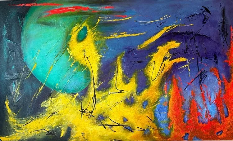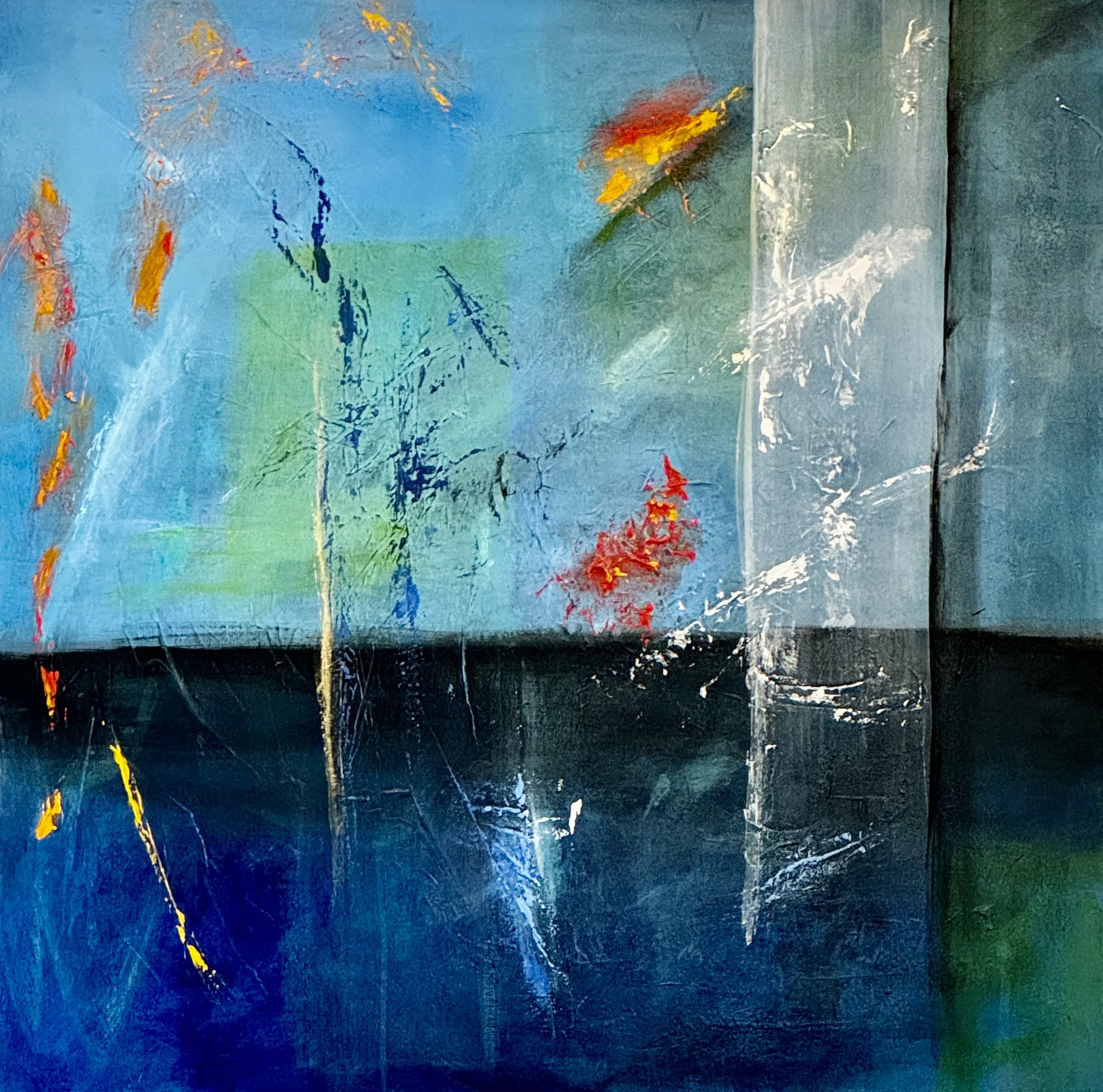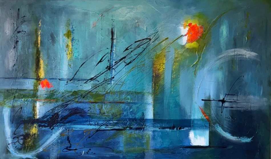 My abstract art differs generally in many ways from my more tranquil collages and they are also, in many cases, quite distinct from each other. I like to think they are alive with energy; indeed, some of the colors, particularly complementary colors when juxtaposed together, literally dance before my eyes. Most of the paintings have layer upon layer of colors incorporated in them and textures that can be appreciated even more so up close. Sometimes my art is initially based on an image or idea of a natural landscape or on a theme such as music and takes shape from there. One color laid down often influences what color, element or shape follows. The process can be quite intuitive, spontaneous and joyous. My mood, music or life’s experiences can also inspire what comes next. As most of us know, art can be influenced by a myriad of factors as dynamic as those that shape life itself. It is my hope that you will enjoy the colors and elements in the paintings and perceive your own meaning in them.